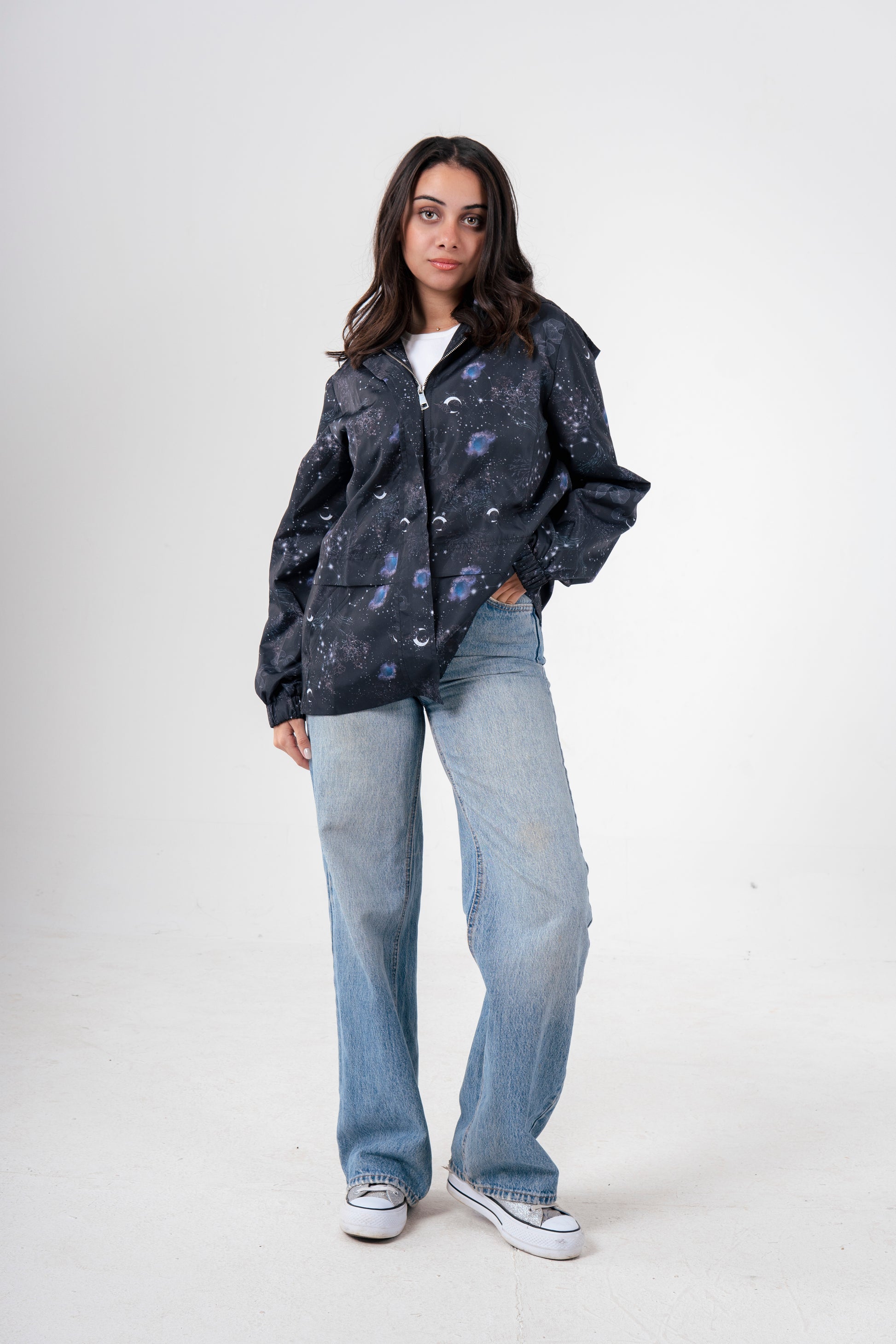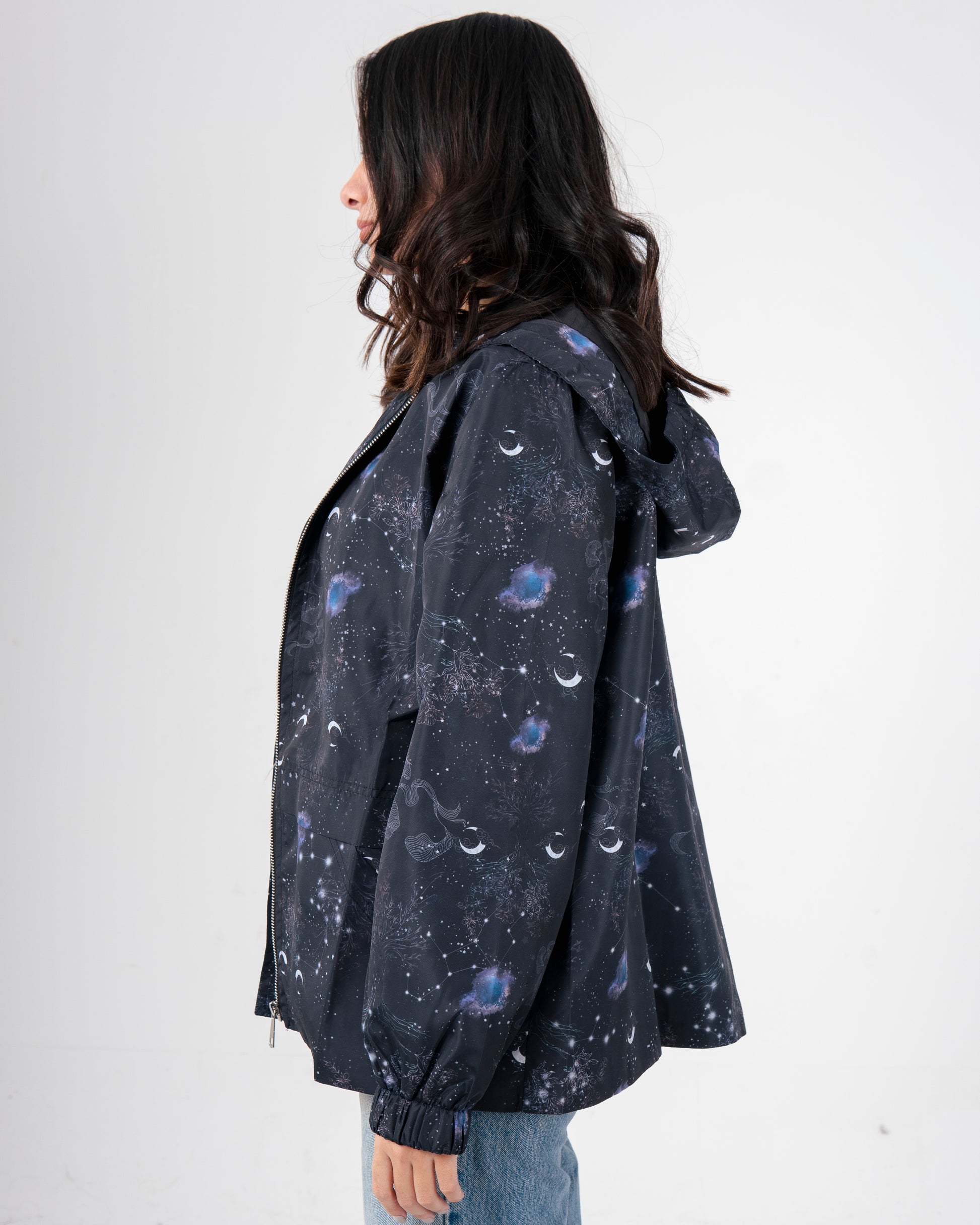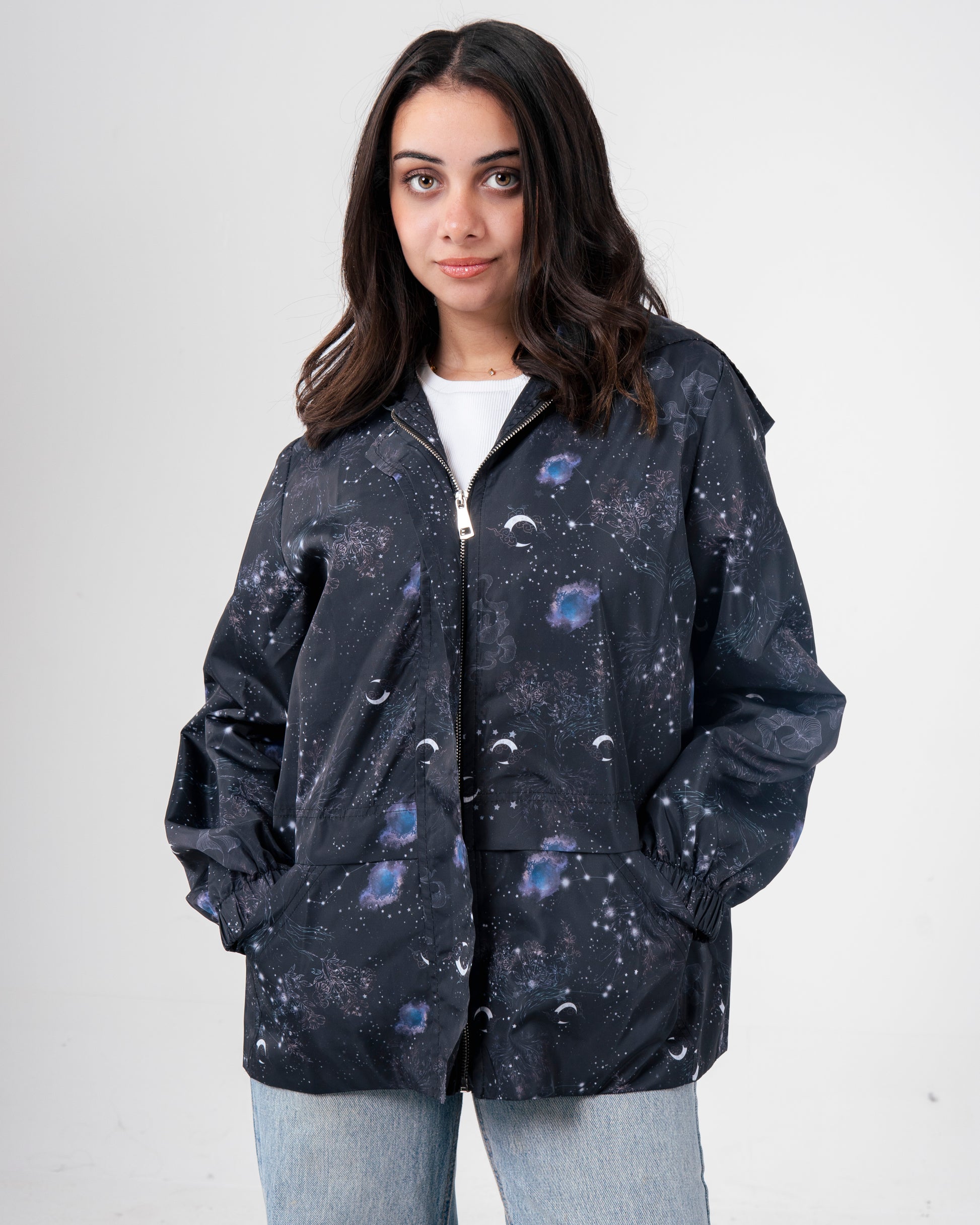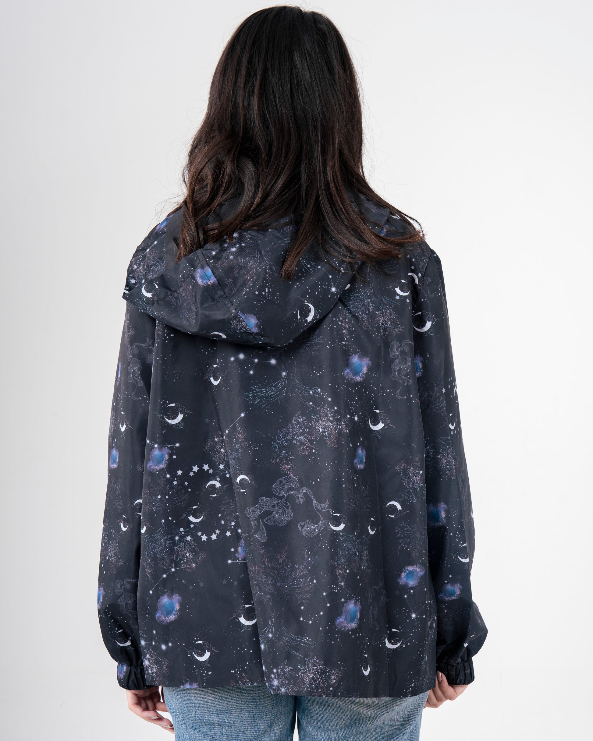 A lightweight waterproof jacket featuring the Celestial print in deep black tones. Designed for winter or any season light for layering and protective for rainy days. Made in small batches with a subtle starry touch.