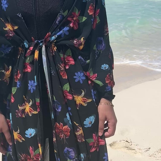 A lightweight floral coverup made from airy chiffon, designed to flow with every breeze. One-size, effortless, and perfect for layering over swimwear or summer looks.