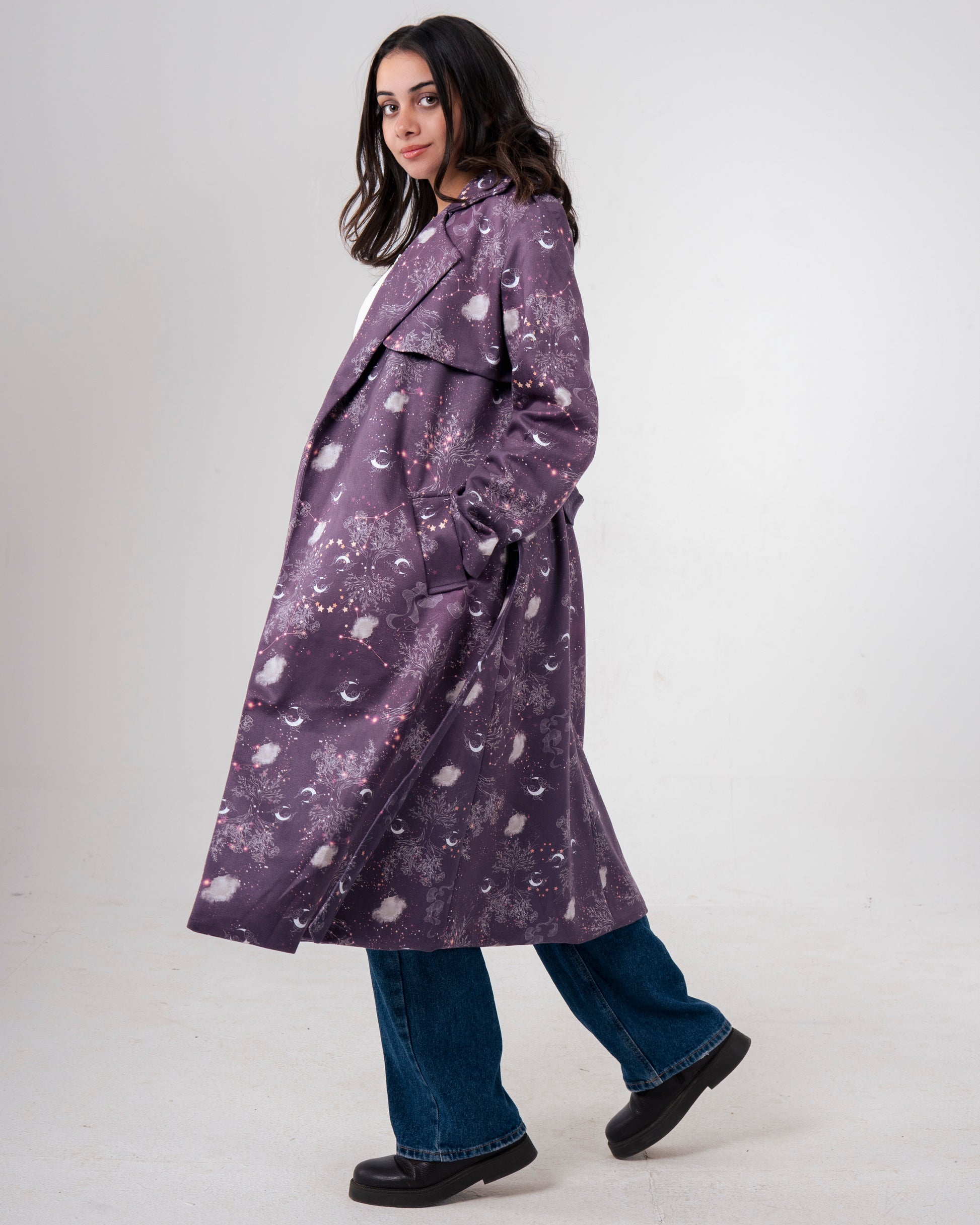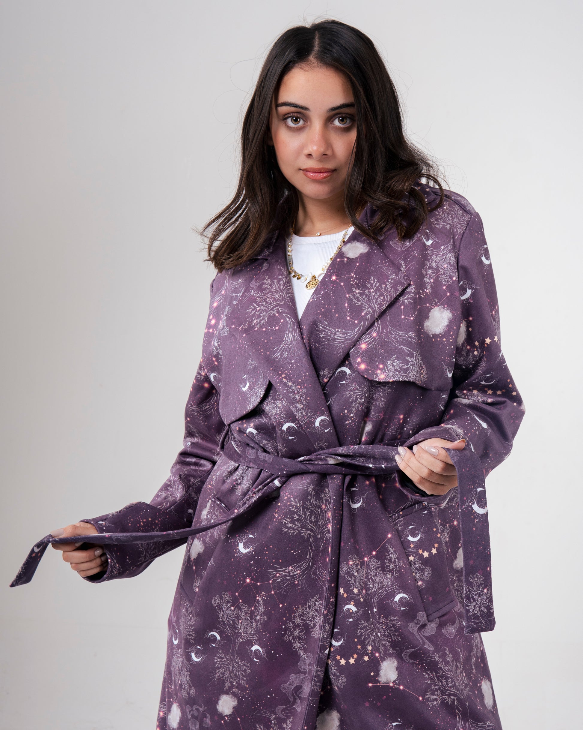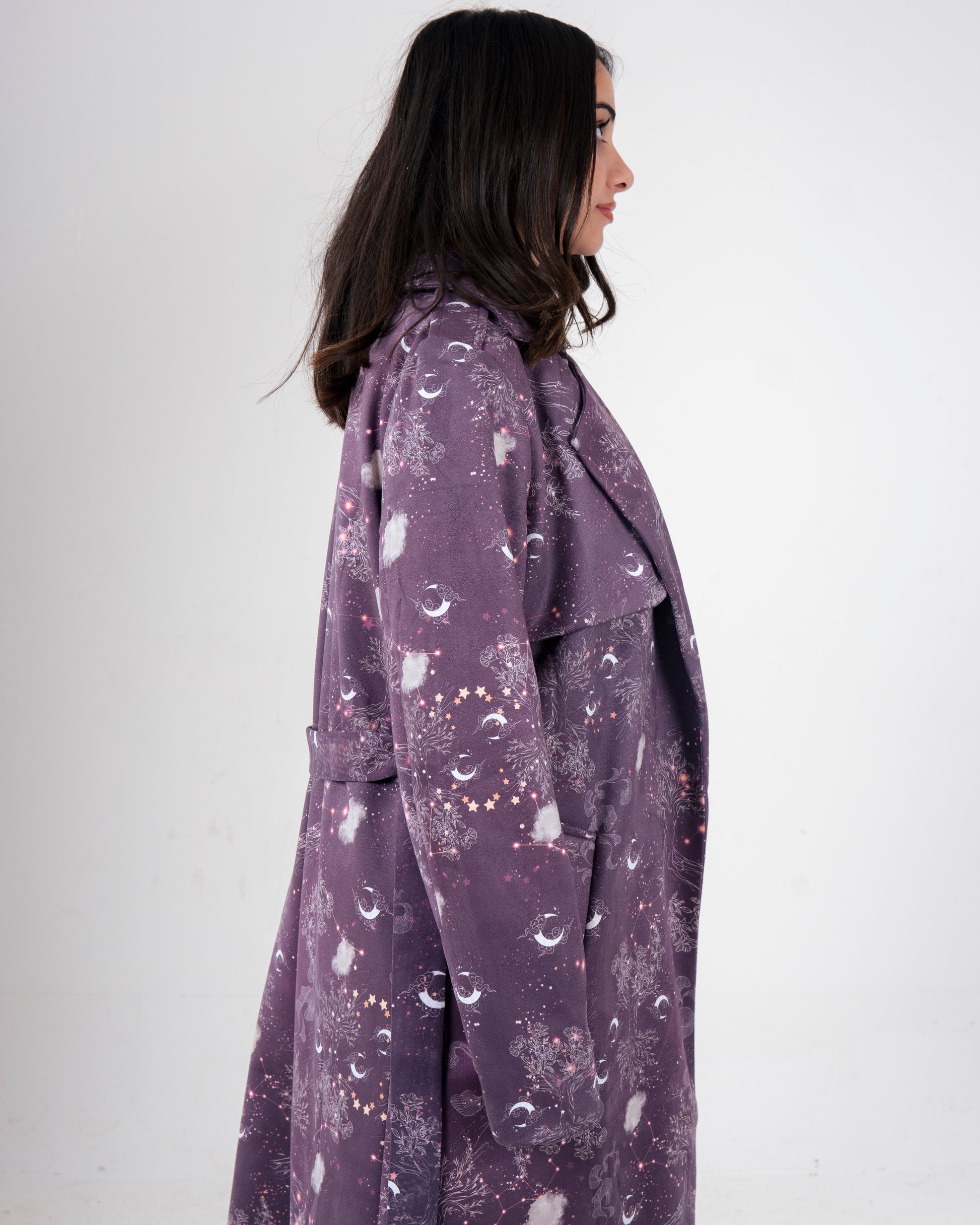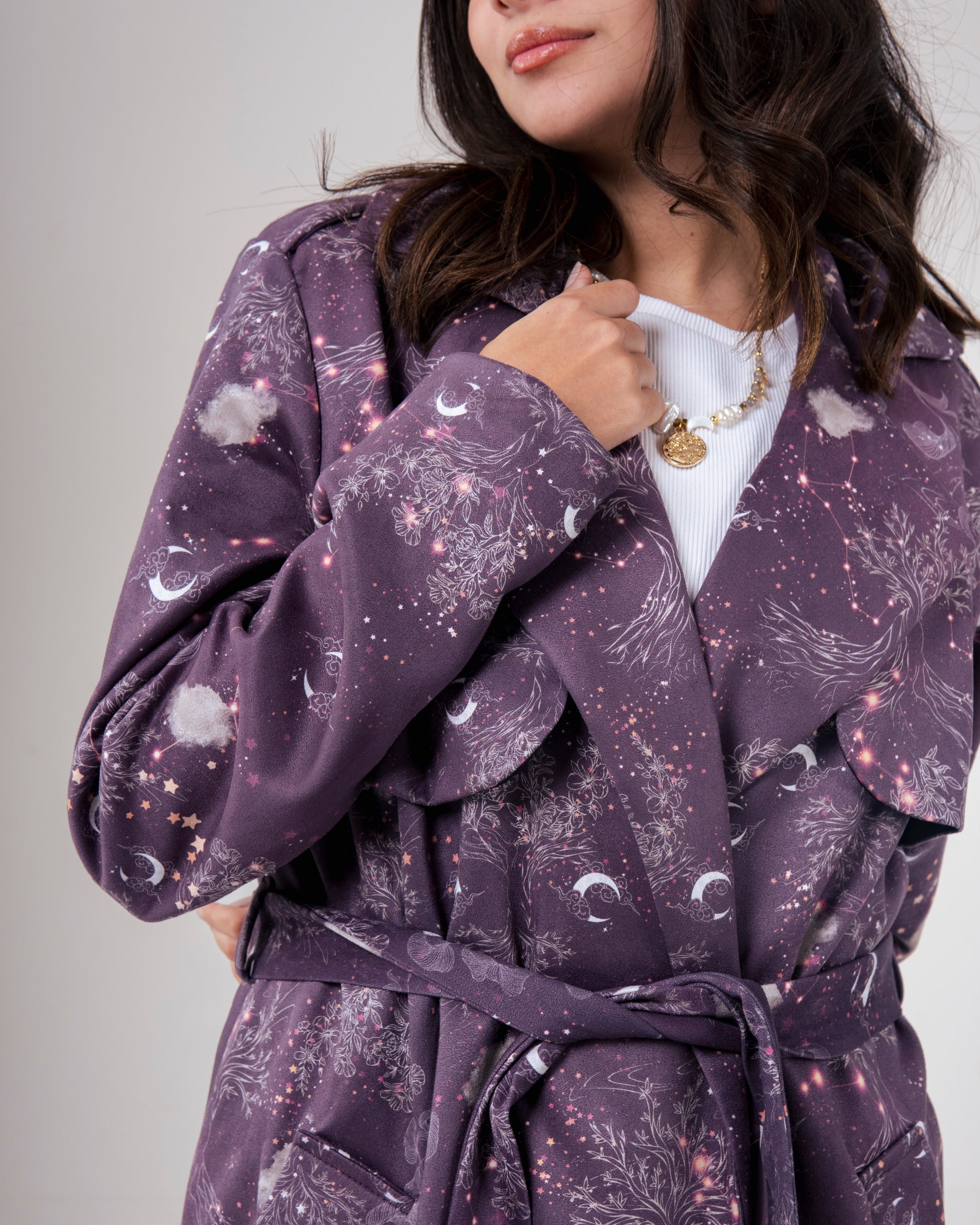 A soft suede coat adorned with the Celestial print in dreamy, starlit tones.