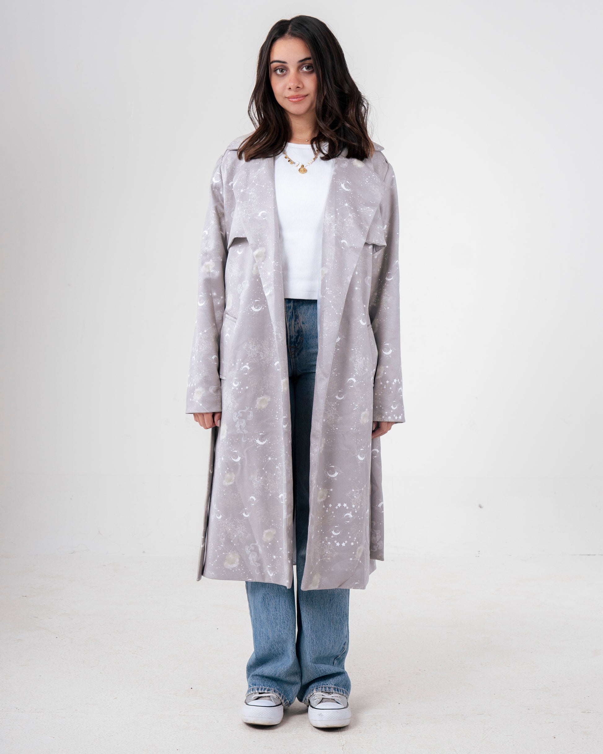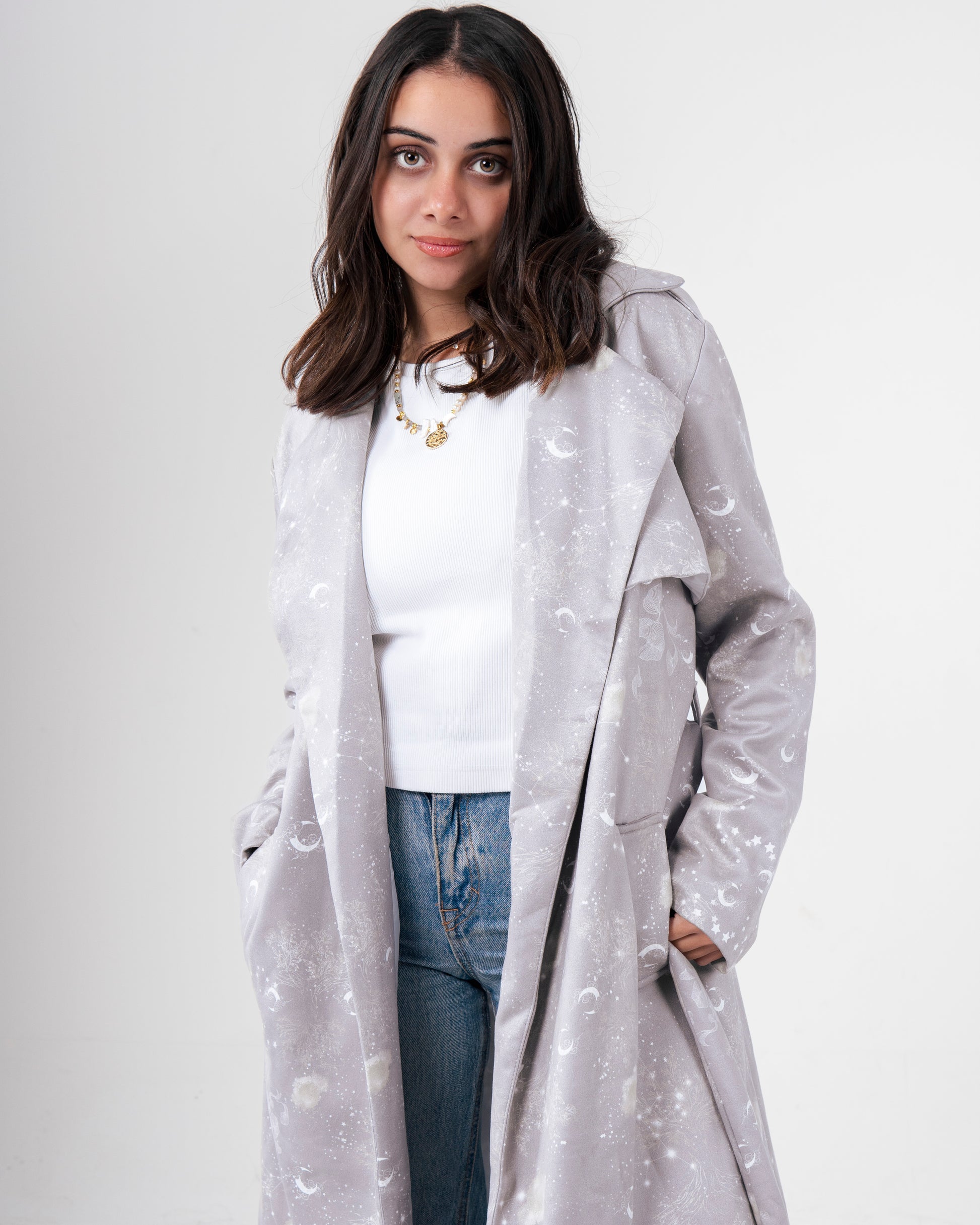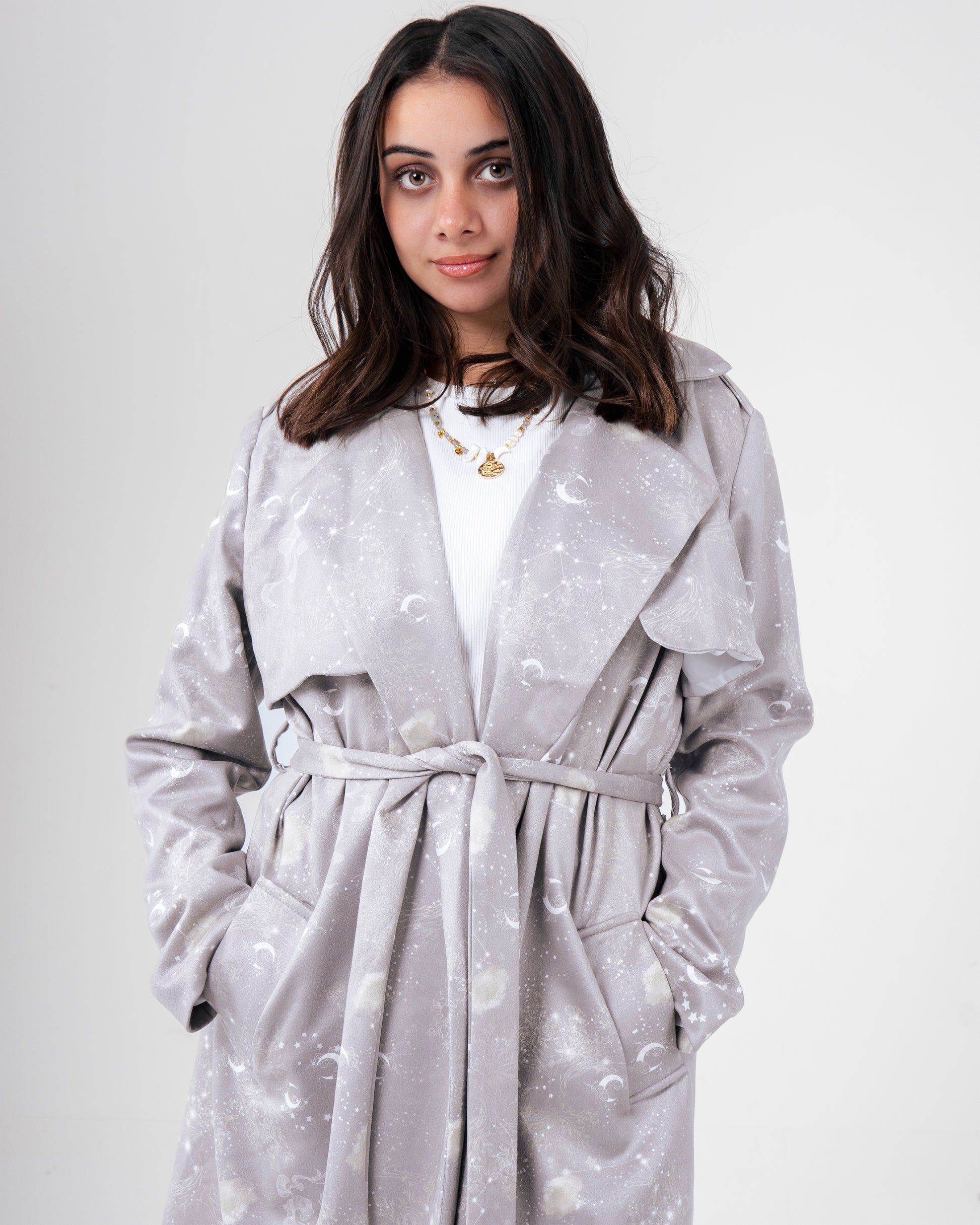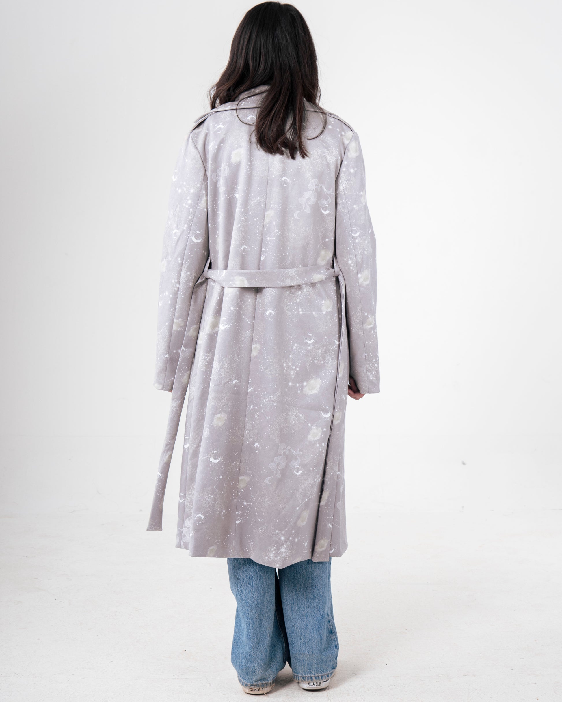 A soft suede coat adorned with the Celestial print in dreamy, starlit tones.