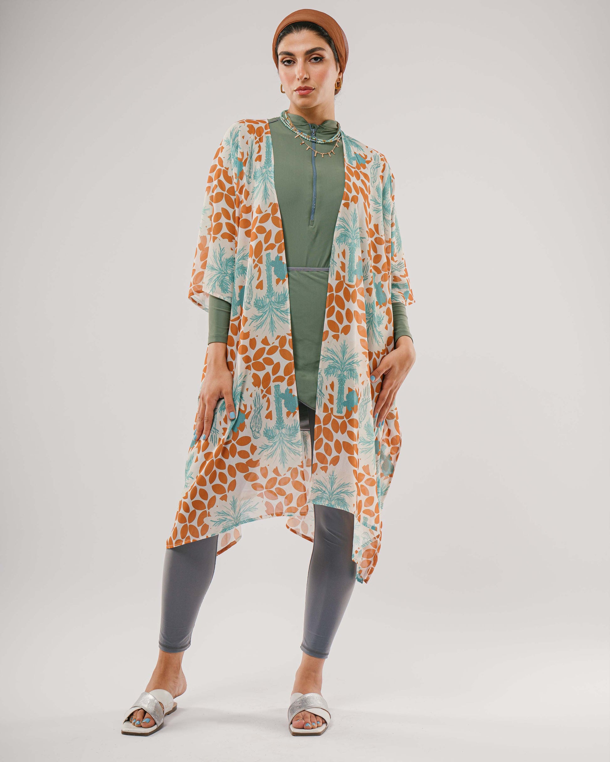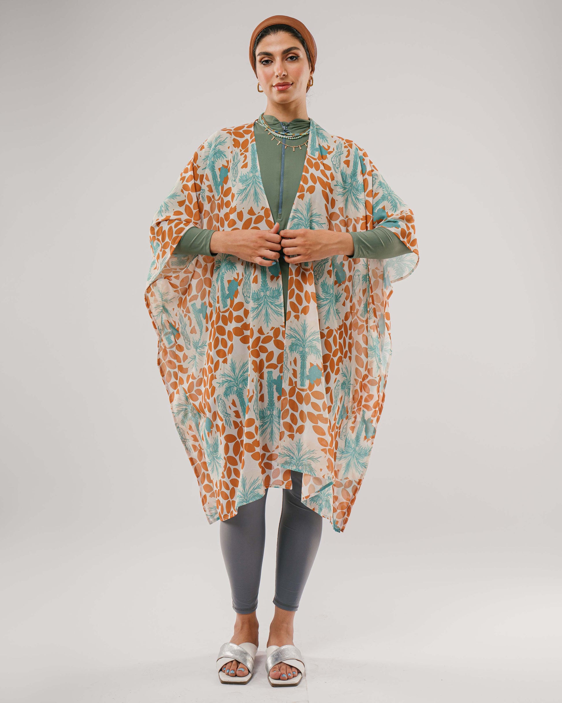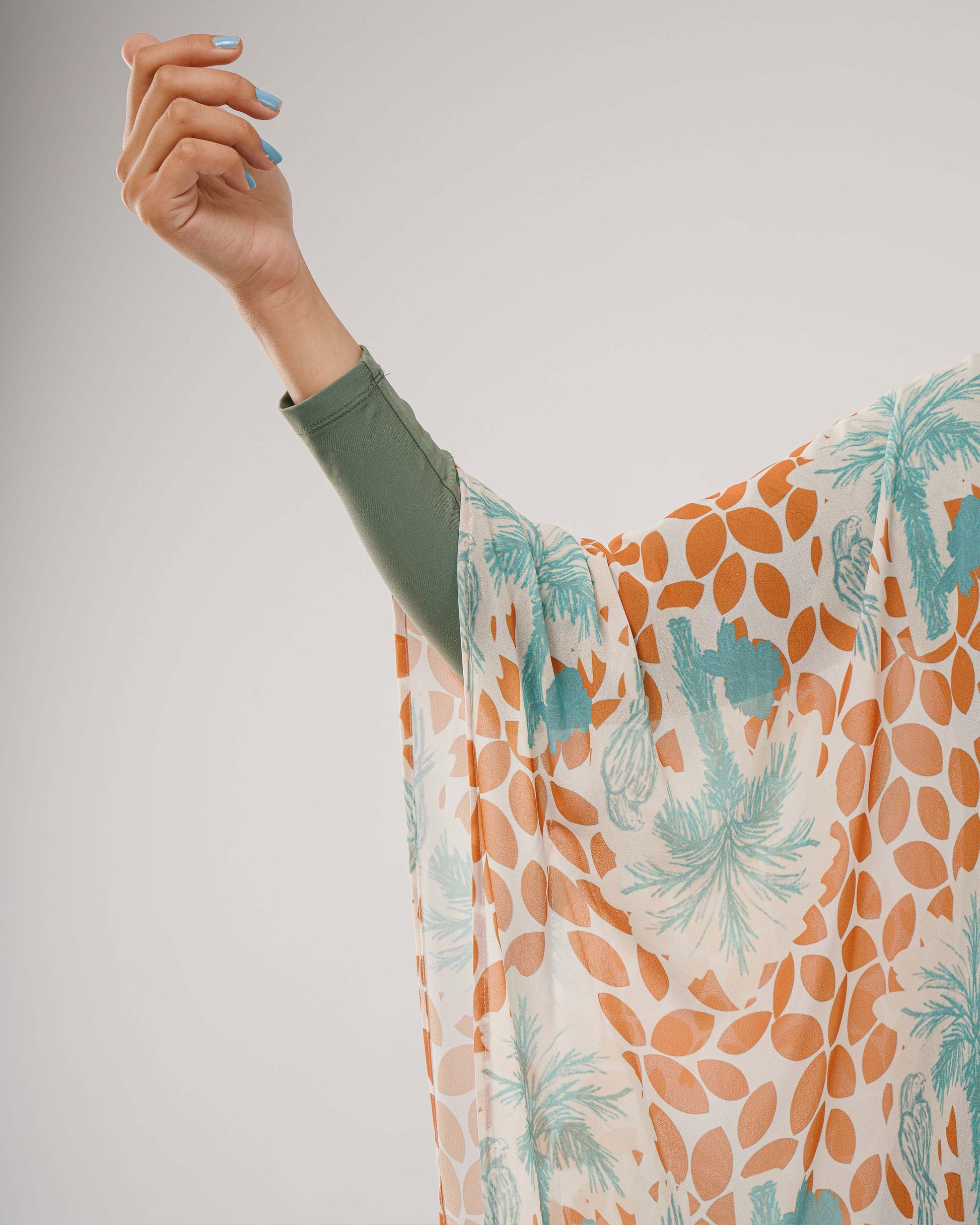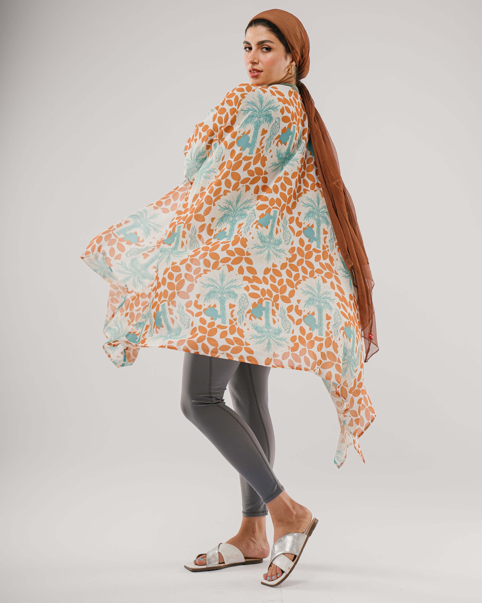 Soft and breezy, Palmora features hand-drawn palms, florals, and a graceful parrot in earthy green and brown tones. Printed on airy chiffon, this one-size coverup brings a touch of boho charm to warm days and sunlit escapes.