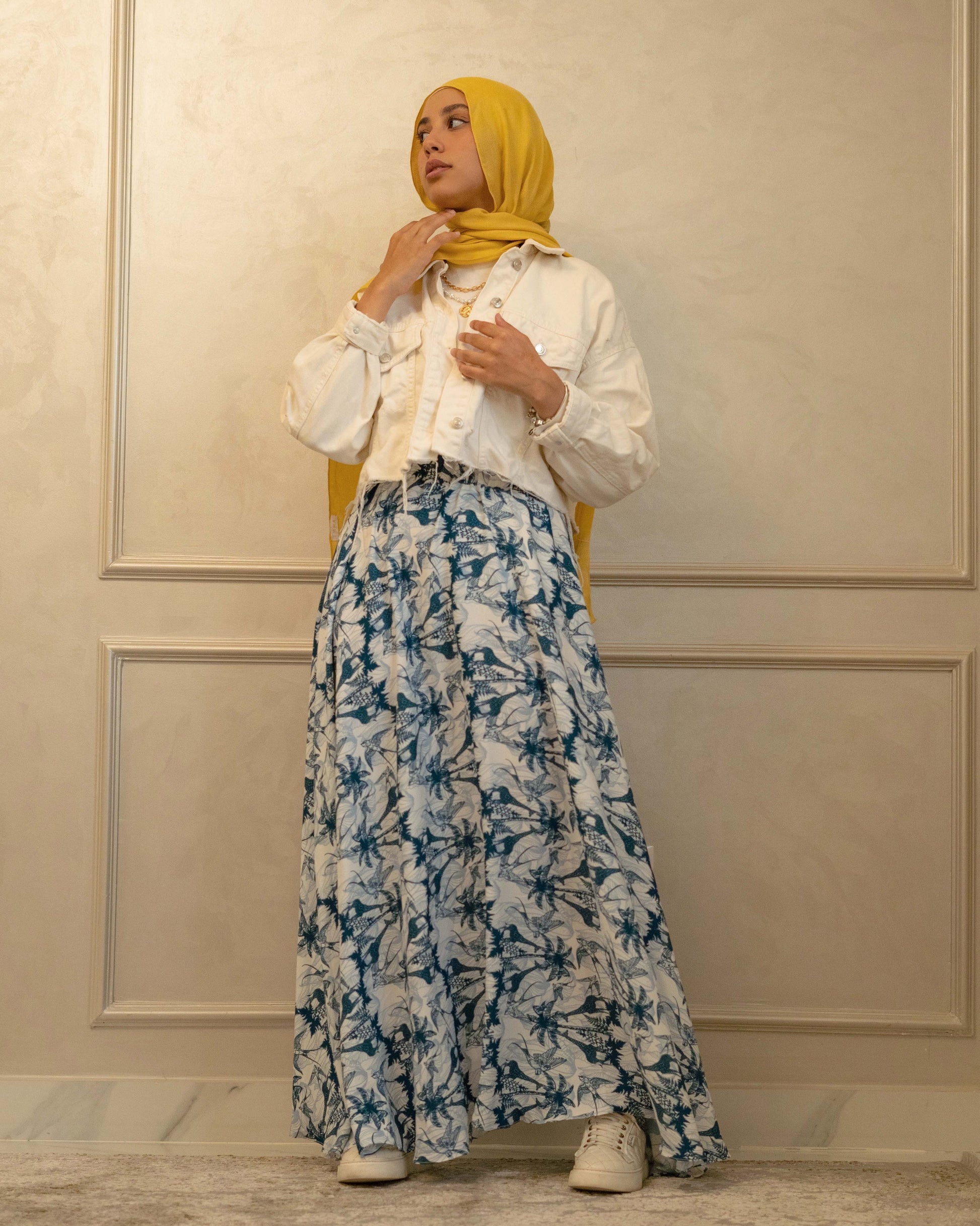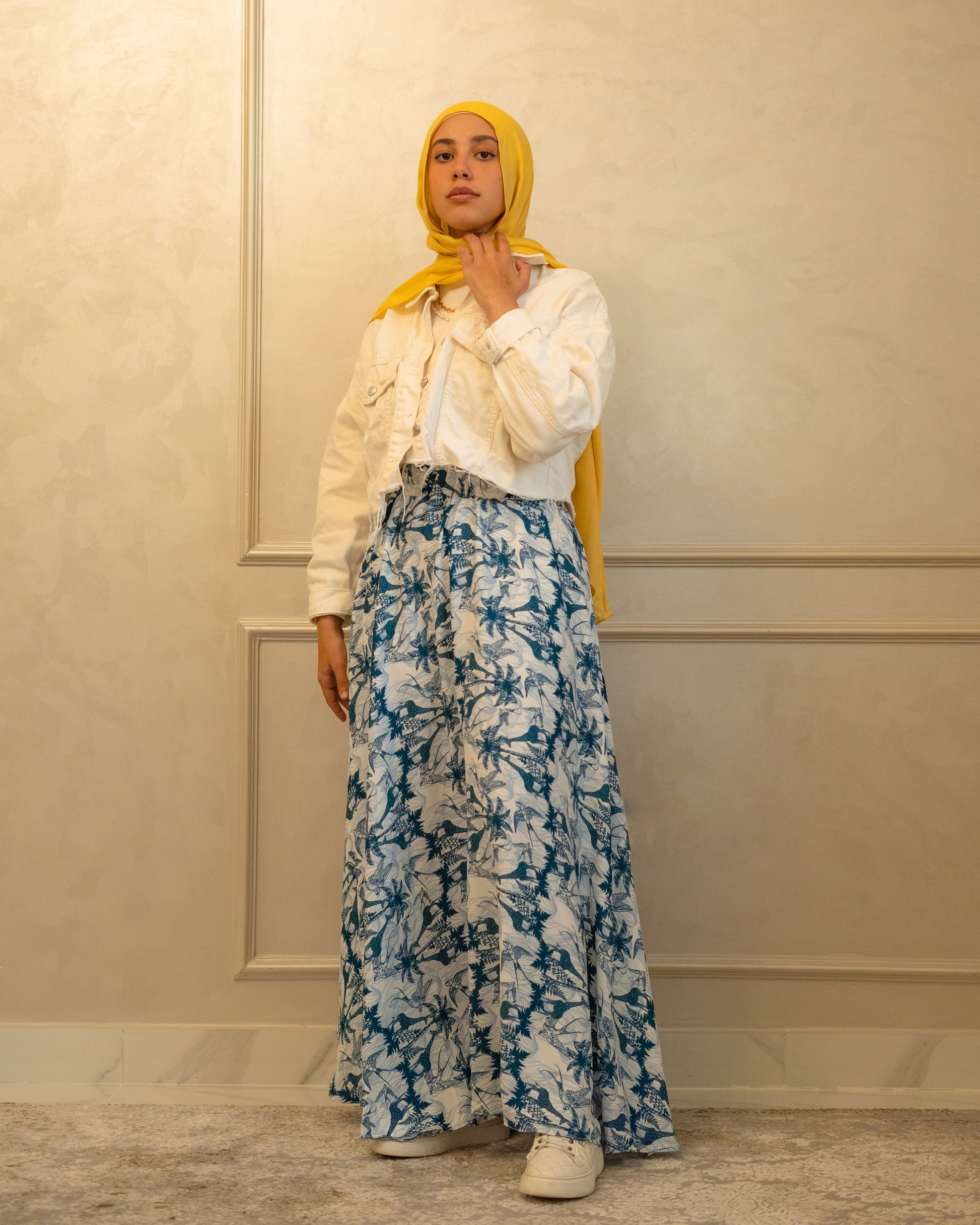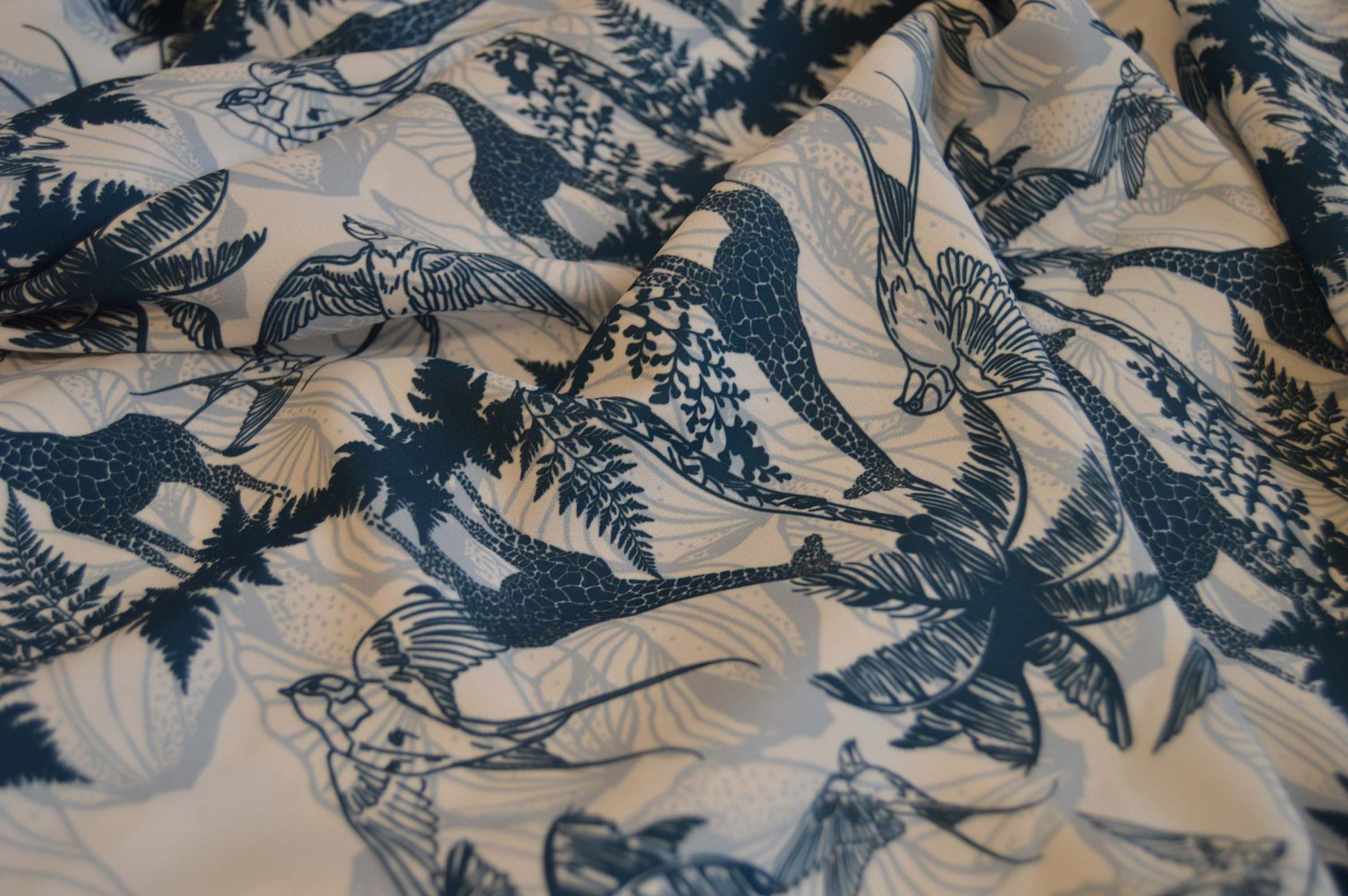A flowing silhouette in soft crepe, Wild Serenade brings nature’s quiet beauty to life in shades of serene blue. Featuring the signature giraffe and bird print, this skirt moves with ease and grace—perfect for daydreamers with a wild soul.